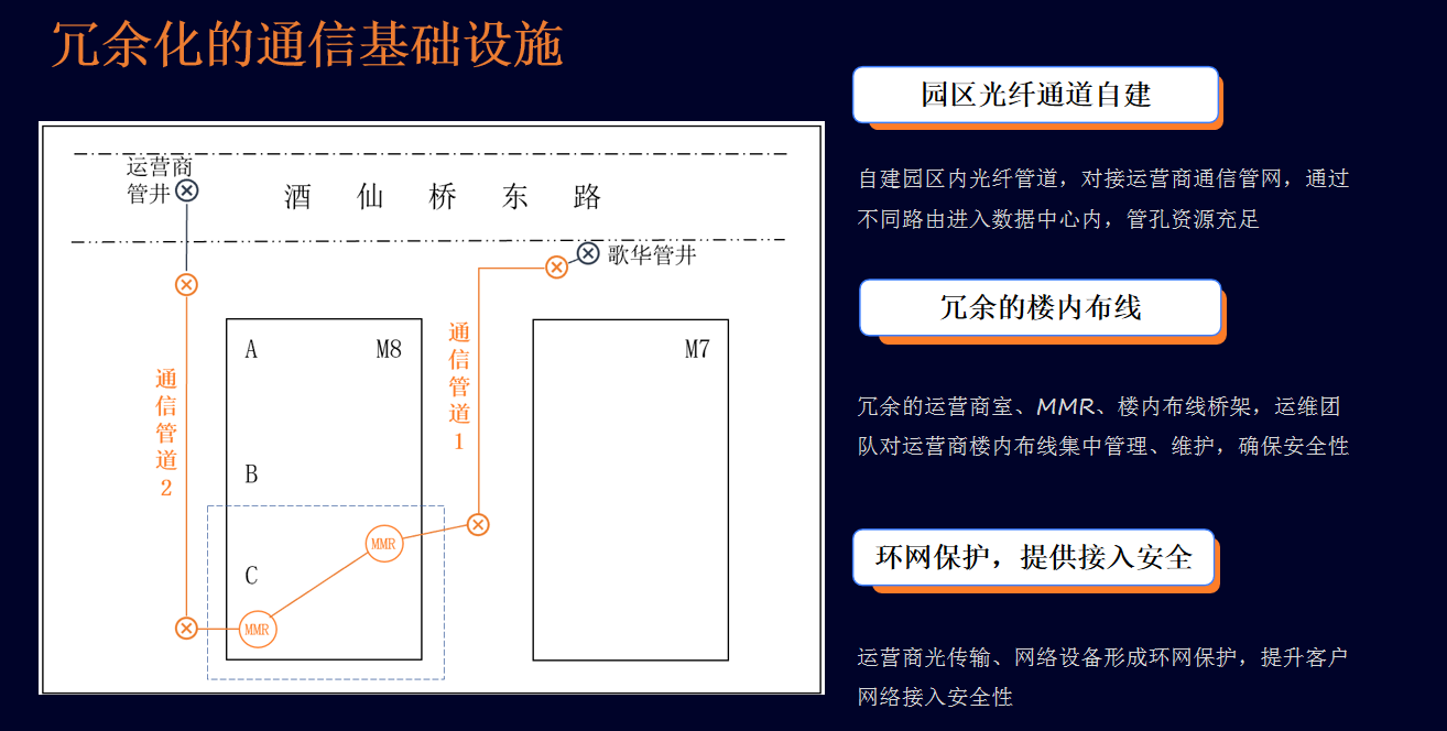 北京酒仙桥机房位于北京市酒仙桥东路1号M8栋C厅,数据中心集中区域,配套设施完善,机房交通便利,北邻机场高速,东接五环路,临近地铁14号线将台站,地铁12号线驼房营站。交通便利、位置优越。园区内自由停车场,与机场/市中心距离: